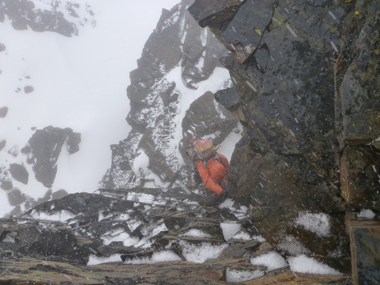 There remains, however, the matter of the summit. We ascend into the snow. The climbing is exposed and strenuous but not hard: